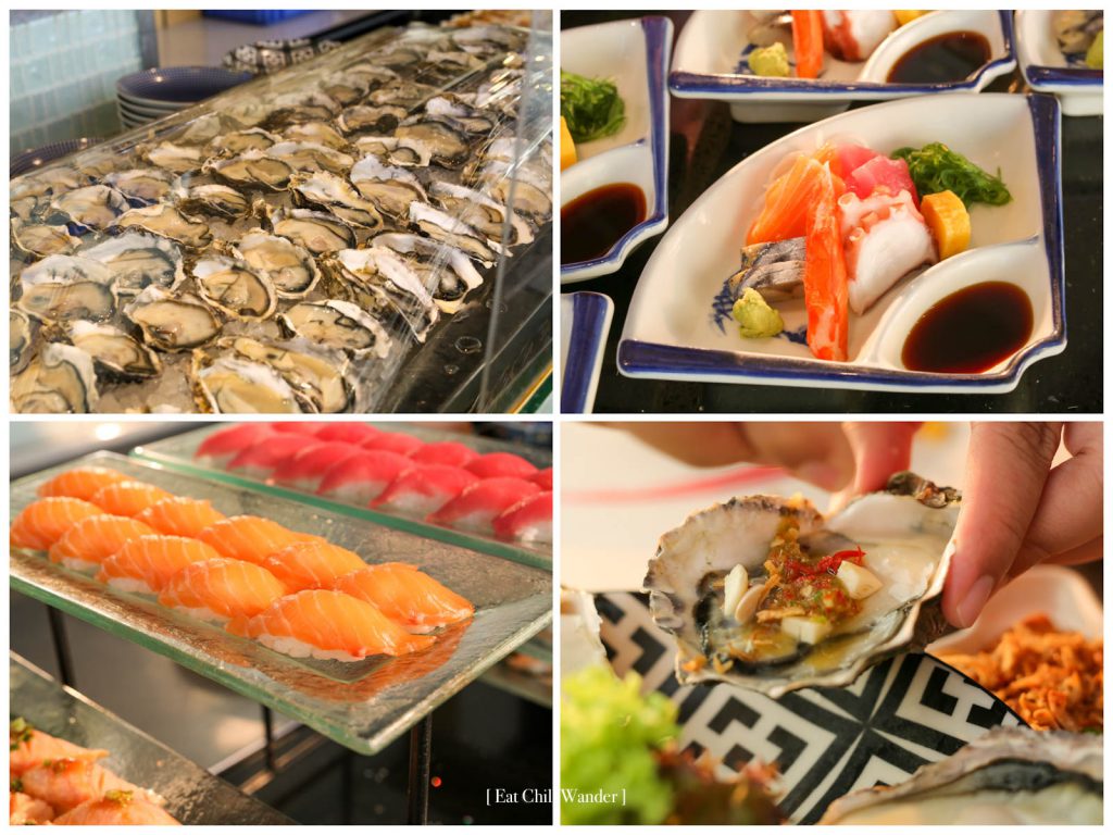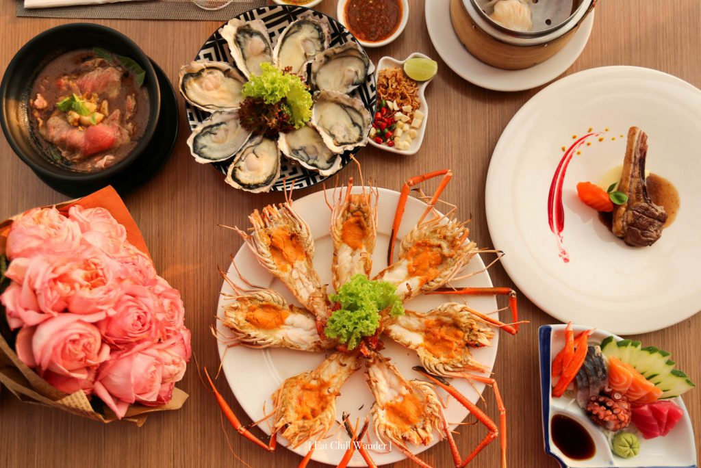 ไลน์อาหารที่นี่จัดเต็มมาก ที่แนะนำสุดๆ คือ กุ้งแม่น้ำย่างไซส์พรีเมียม, หอยนางรม, ซาชิมิ, เป็ดย่าง, หมูหัน, สเต็กแซลมอน, ฟัวกราส์, วากิวน้ำตก ดีมากเลยค่ะ แถมยังมีเครื่องดื่ม น้ำ ขนมหวาน เค้กช๊อคโกแลตสวยๆ จัดเต็มมากๆ ค่ะ แพนเค้กเด้งดึ๋ง ชานมไข่มุก