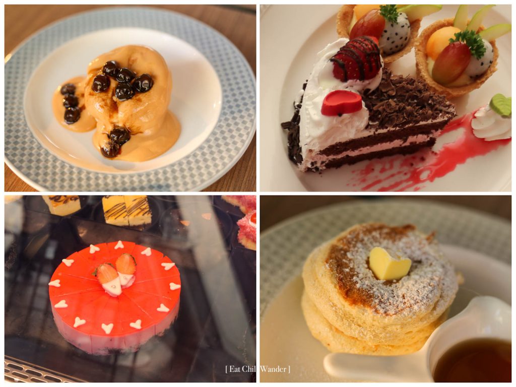 นอกจากนี้ของหวานก็จัดเต็มมากๆ เลยค่ะ มีข้าวเหนียวทุเรียน ผลไม้ เค้กมีให้เลือกเป็นสิบๆ อย่างเลย ทาร์ทต่างๆ มีขนมไทย ทองหยอด ลูกชุบ ขนมกล้วย แพนเค้กเด้งชานมไข่มุก