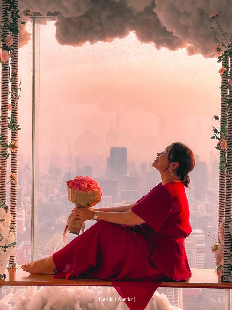 แต่งเต็ม หอบช่อดอกไม้มาได้เลยนะคะ มีคนมาฉลองกันเต็มเลย ขึ้นมาที่ล็อบบี้ชั้น 18 ก่อน แล้วเปลี่ยนลิฟท์ขึ้นมาที่ชั้น 81 ค่า