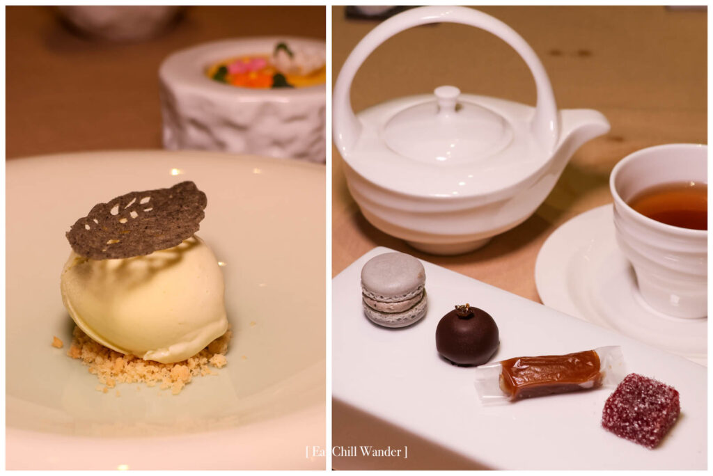 ปิดท้ายด้วย Hu Sik – Korean-Inspired Desserts เสิร์ฟเป็นไอศครีมสาหร่ายรสชาติดี กับ ซอร์เบตส้มให้ความสดชื่น และตามด้วย Da Gwa – Petit Fours ประกอบด้วย มาการองงาดำ ช๊อคโกแลตพุทรา ราสป์เบอร์รี่เจลลี่ และ โสมแดงค่ะ