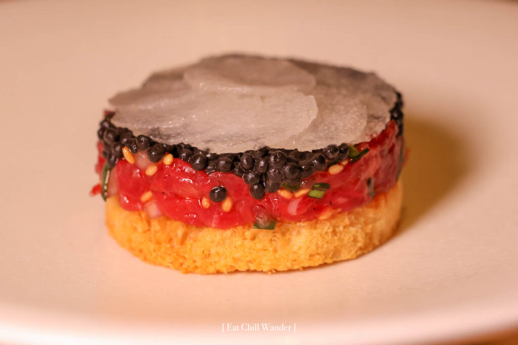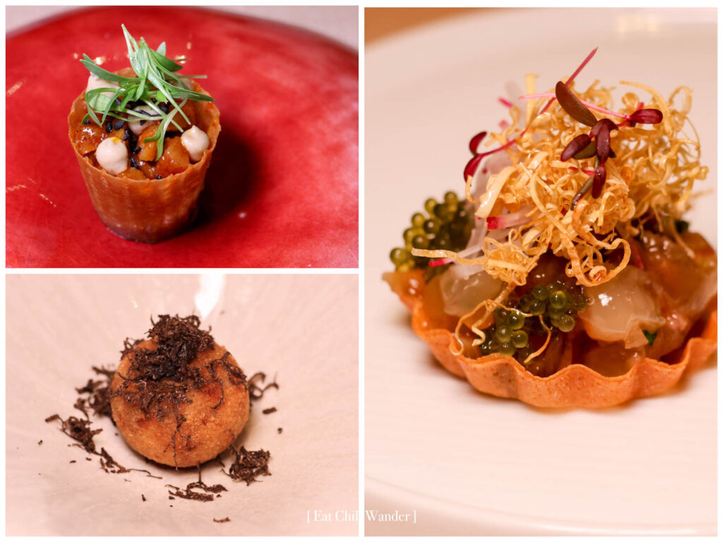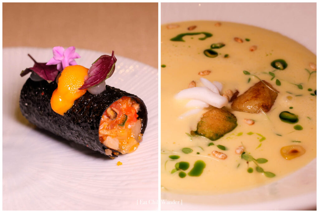 เริ่มที่คำเรียกน้ำย่อย 5 จาน ได้แก่ Saewoo Jang – Shrimp Tartlet เริ่มจากเมนู “จัง” ซึ่งหมายถึงพวกของหมักหรือดอง เสิร์ฟเป็นกุ้งหวานหมักโชยุเกาหลี มียูสุพูเร โรยคอมบุทอดกรอบ ในแป้งทาร์ทบางกรอบ เปิดต่อมรับรสได้ดี