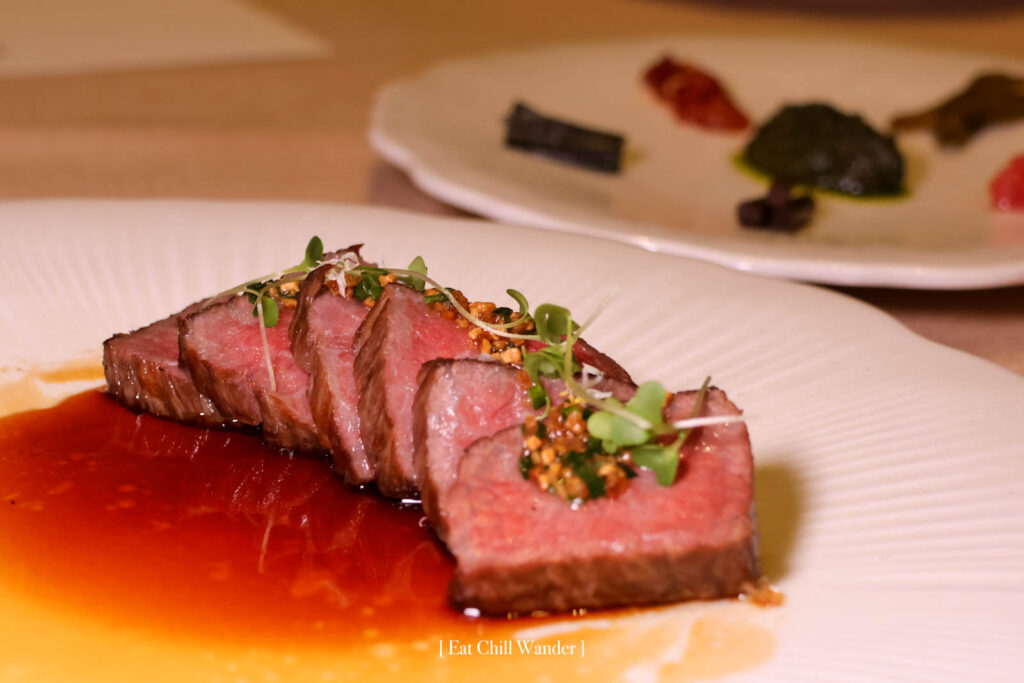 ตามด้วย Yukhoe – Korean-style Beef Tartare เนื้อทาร์ทาร์สไตล์เกาหลี ที่ใช้เนื้อวากิวปรุงแบบเกาหลี เนื้อนุ่ม เสิร์ฟบนบริออชกรอบ ท็อปด้วยสาลี่ เรียกว่าเสิร์ฟอาหารเกาหลีหลากหลายการปรุงเลย