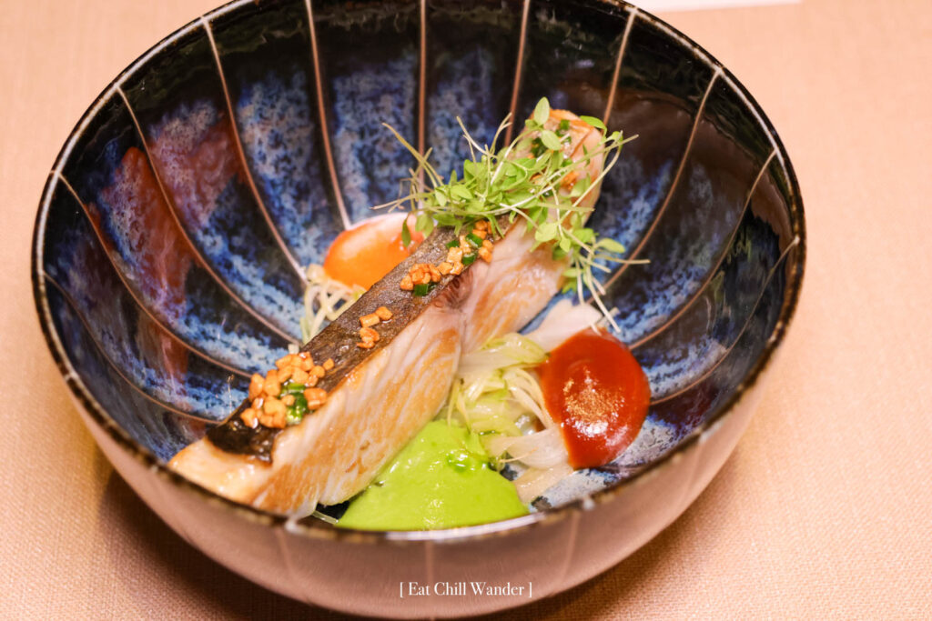Samchi Gui – Charred Mackerel ปลาแมคเคอเรลย่าง เสิร์ฟพร้อมกับซอสสามแบบคือ ซอสซัมจังสีแดง ซอสกุยช่ายฝรั่ง และ ซอสพริกแดง ซึ่งเชฟให้ลองทานกับซอสต่างๆ ตัวซอสพริกแดงกับซอสกุยช่ายทานรวมกันแล้วมีมิติของรสชาติที่ดีค่ะ ซัมจังก็จะทำให้รสชาติเข้มข้นขึ้น