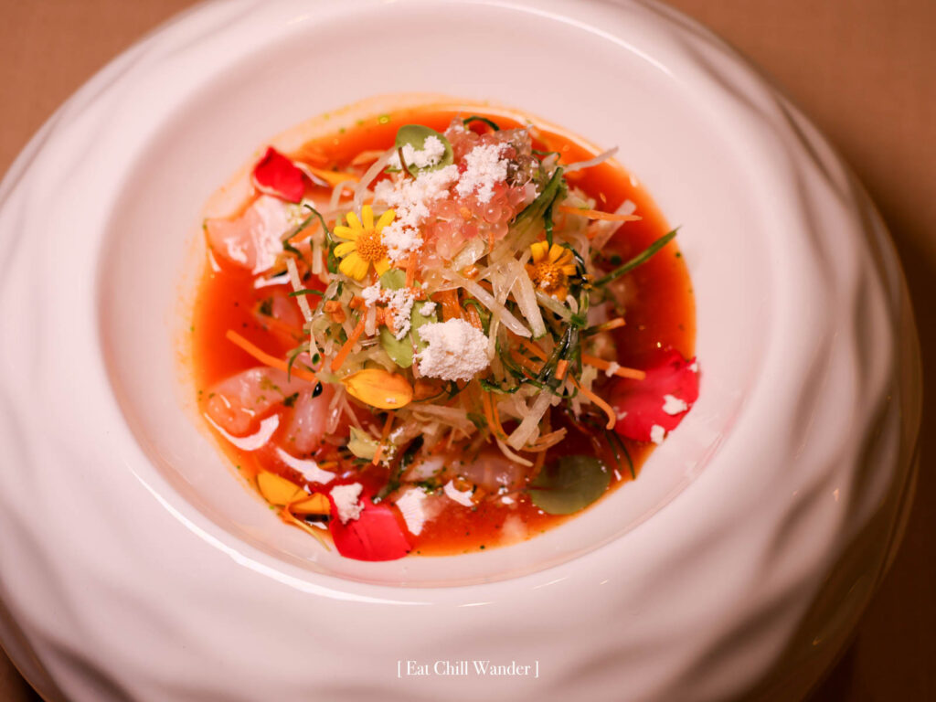 Mul Hoe – Chilled Raw Fish with Chilli Broth ซุปปลาดิบ ซึ่งตัวเดรสซิ่งจะเป็นน้ำจากการหมักกิมติ มีความเปรี้ยวสดชื่น ปลาหมึกนุ่ม ปลามาไดมีความอุมามิ ตัดกับความกรอบของผัก เข้ากันดีมากค่ะ จานนี้นัทชอบมาก