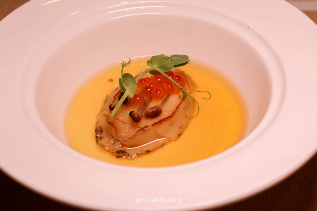 Abalone Jim – Egg Custard with Abalone Egg เมนู “จิม” คืออาหารประเภทตุ๋นค่ะ จานนี้ที่บอกว่า ไข่ตุ๋นเนื้อเนียนมากๆ เสิร์ฟกับหอบเป๋าฮื้อตัวโต มีความนุ่มเด้ง ท็อปด้วยไข่ปลาแซลมอน ละมุนมากๆ
