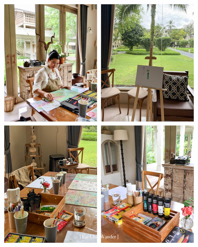 เป็นเวิร์กชอปศิลปะในโครงการ Artist-in-Residence ที่จะเชิญศิลปินมาประจำอยู่ที่รีสอร์ท และเชิญชวนผู้เข้าพักมาหยุดพักจากความวุ่นวาย มาใช้ช่วงเวลาสงบๆ ในการสร้างสรรค์ผลงานศิลปะ โดยกิจกรรมจะจัดขึ้นในห้องสมุดของเทวาศรม ซึ่งถูกออกแบบให้เป็นพื้นที่แห่งแรงบันดาลใจ เราได้ลองปล่อยใจ ใช้ใจนำ ละเลงสีลงไปอย่างผ่อนคลาย เชื่อมต่อกับอารมณ์ ความคิด และธรรมชาติรอบตัวอย่าง เป็นอีกหนึ่งกิจกรรมที่ได้อยู่กับตัวเอง Mindful มากๆ และเวลาผ่านไปเร็วมาก เติมเต็มทั้งความคิดสร้างสรรค์และการพักผ่อนได้อย่างดีเลยค่ะ