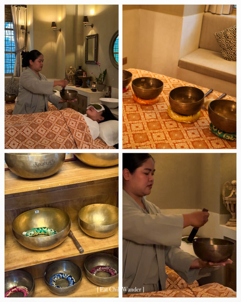 อีกประสบการณ์ที่เราได้เข้าร่วมคือการทำ Sound Bath ค่ะ จริงๆ แล้วที่เทวาศรมมีกิจกรรม Aqua Sound Bath คือการทำ Sound Bath โดยให้เรานอนลอยอยู่บนน้ำ นอกจากคลื่นความถี่ของเสียงที่เป็นพลังงานเข้ามาให้เราผ่อนคลายแล้ว การลอยอยู่บนน้ำยังจะมีความอิสระอีกด้วยค่ะ แต่เสียได้ที่ฝนตก เราเลยได้ทำ Sound Bath ในห้องทรีทเม้นท์ที่สบายมากๆ