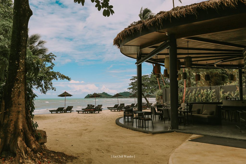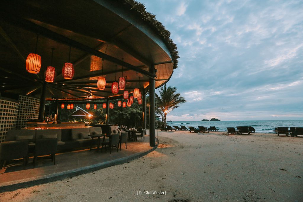 ห้องอาหารและบาร์ริมทะเลของที่นี่ ด้วยตำแหน่งที่หันหน้าไปทางทิศตะวันตก ทำให้เราสามารถมานั่งเล่น ชมพระอาทิตย์ตกสวยๆ ที่นี่ได้ ส่วนของบาร์ก็มีความเก๋ เป็นรูปวงกลมโค้งไปกับทะเล นั่งตรงไหนก็บรรยากาศดี