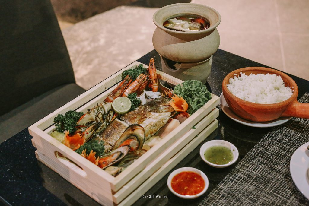 คืนแรกเราทานเป็น Seafood Set อาหารทะเลเต็มตะกร้า เสิร์ฟพร้อมกับต้มยำ ข้าวสวย และ ของหวาน