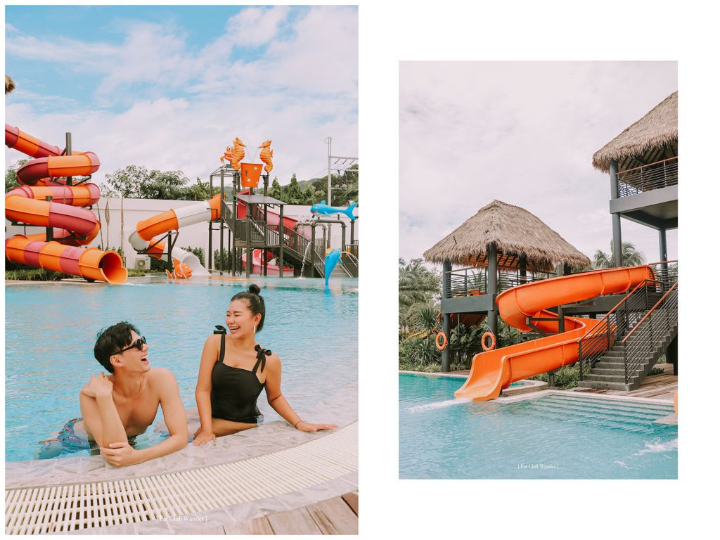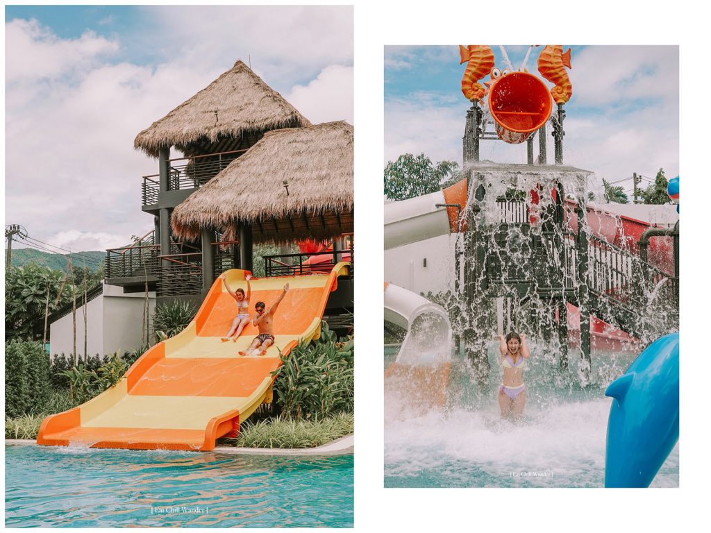 จริงๆ เราชอบตั้งแต่สระว่ายน้ำที่พื้นเป็นสีขาว ทำให้น้ำออกเป็นสีฟ้า สวยมากกกกก แบบอยากลงไปเล่นตลอดเลย ที่นี่จะแบ่งเป็นสระผู้ใหญ่ มีสไลเดอร์ 3 อัน อันสีชมพูสลับส้มคือพีคสุด กรี้ดดังสุด มันส์สุด ส่วนสีส้มก็สนุกนะคะ แต่เบากว่า แล้วก็จะมีตัวที่เป็นคลื่นๆ ลงมาพร้อมกัน 2 คนได้ สนุกมากกกก