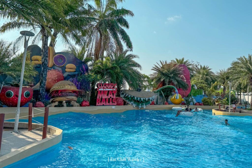 ใครที่เล่นเครื่องเล่นหวาดเสียวมาเยอะแล้ว อยากจะพักชิลล์ๆ ต้องมาลอยคออยู่ในสระน้ำวน Lazy River ที่จะค่อยๆ หมุนไปเรื่อยๆ ช้าๆ ยาวถึง 335 เมตร มาในธีม Cloudy with a chance of meat balls น่ารักมากๆ ค่ะ