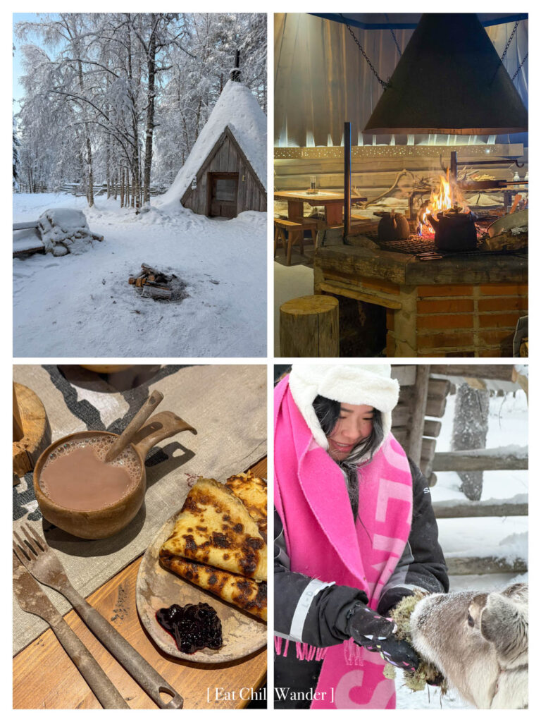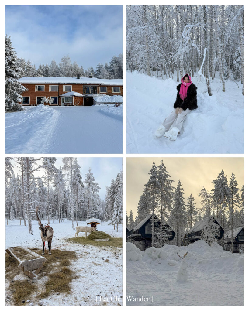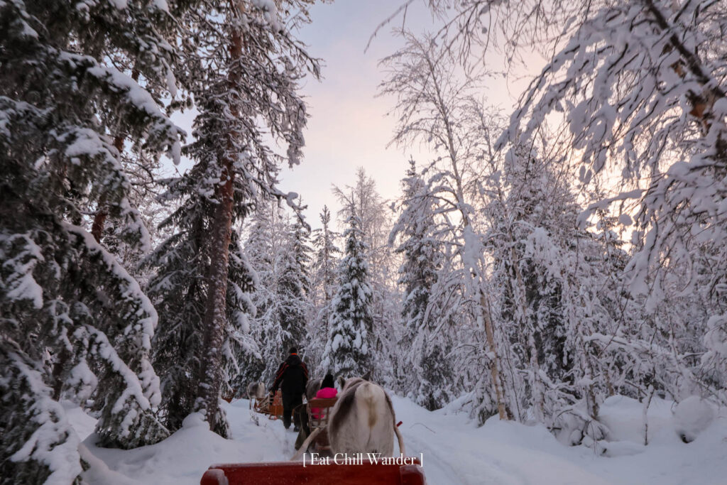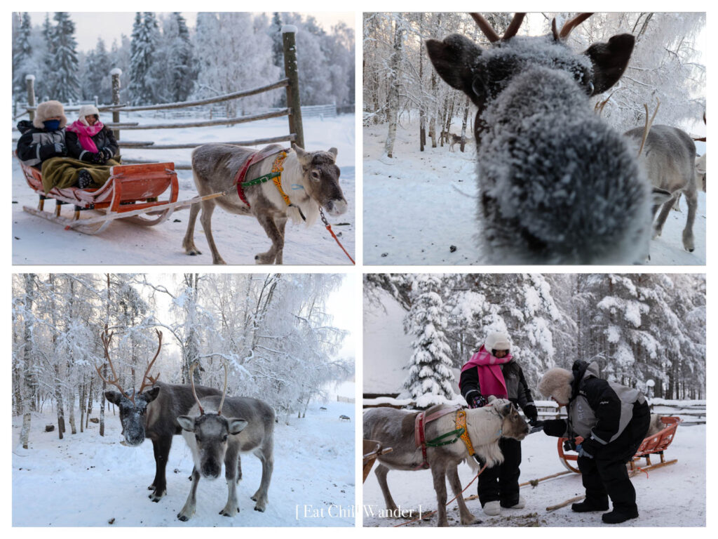 แน่นอนว่า เราเลือกแบบ 2 กิโลเมตร เพราะอยากนั่งเข้าไปในป่า วิวเป็นป่าสนขาวโพลนที่สวยงามมาก เหมือนหลุดเข้าไปในหนังเรื่อง Frozen เลยค่ะ เสร็จแล้ว เราก็จะได้ให้อาหารกวางเรนเดียร์ที่ลากเรามา แล้วเจ้าของฟาร์มจะพาเราไปในกระท่อมดั้งเดิม นั่งผิงไฟ ทานแพนเค้ก ดื่มช็อกโกแลตร้อน และเล่าเรื่องราวการเลี้ยงกวางให้ฟังค่ะ