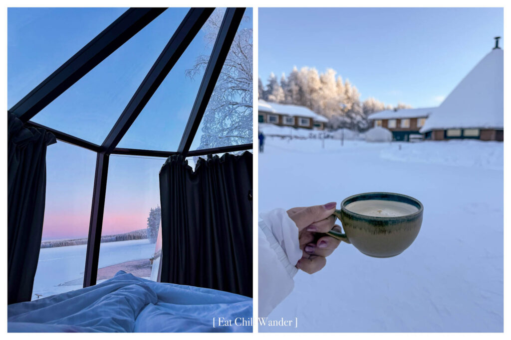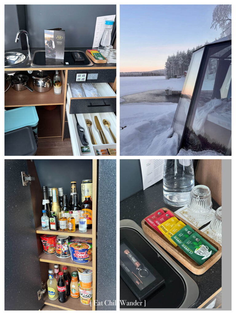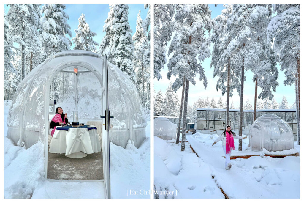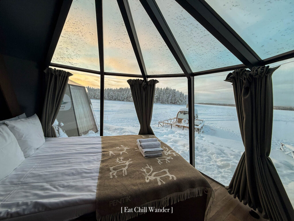 ที่พักของเราในคืนนี้เป็นแบบ Glass Igloo ค่ะ ที่นี่จะใช้รูมไทป์ชื่อว่า Aurora Nest มันน่ารักมากกกกกก การนอนในที่พักแบบ Glass Igloo ใน Finland ถือเป็นอีกหนึ่งในประสบการณ์ที่โดดเด่นที่สุดของการท่องเที่ยวแถบอาร์กติก เพราะตัวที่พักถูกออกแบบให้มีหลังคากระจกใสแบบพาโนรามา ทำให้สามารถนอนมองท้องฟ้า ดาว หรือแม้แต่แสงเหนือได้จากเตียงอย่างสบายๆ (ในคืนที่เราพักที่นี่ เมฆหนามากๆ ทำให้ไม่เห็นอะไรเลย จริงๆ จะขับรถออกไปล่าแสงเหนือก็ได้นะคะ แต่ข้างในห้องมันอุ่นแล้วเตียงสบายมากก็เลยไม่อยากออกไปไหน)